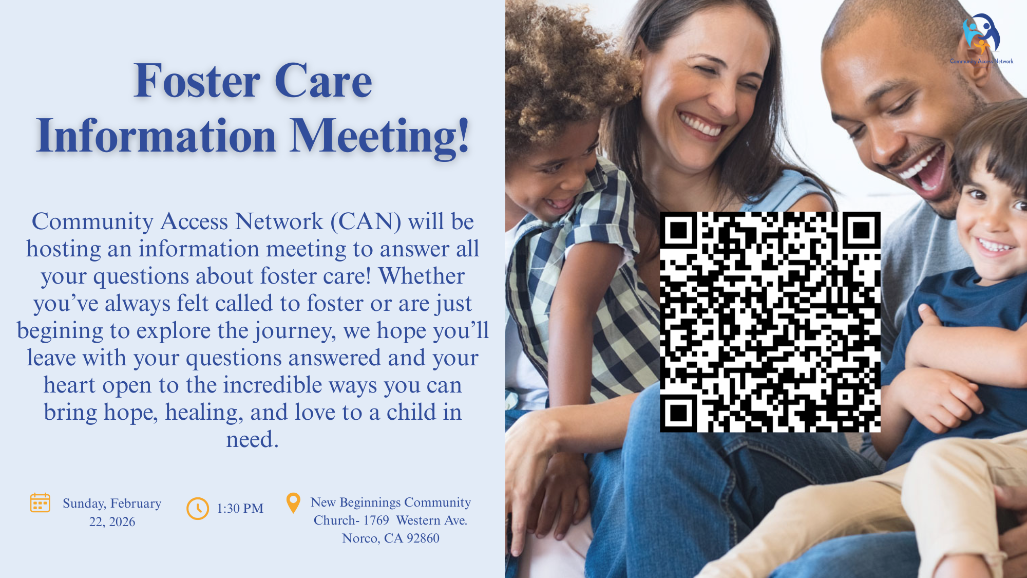 Community Access Network (CAN) will be hosting an information meeting to answer all your questions about foster care! Whether you've always felt called to foster or are just begining to explore the journey, we hope you'll leave with your questions answered and your heart open to the incredible ways you can bring hope, healing, and love to a child in need.