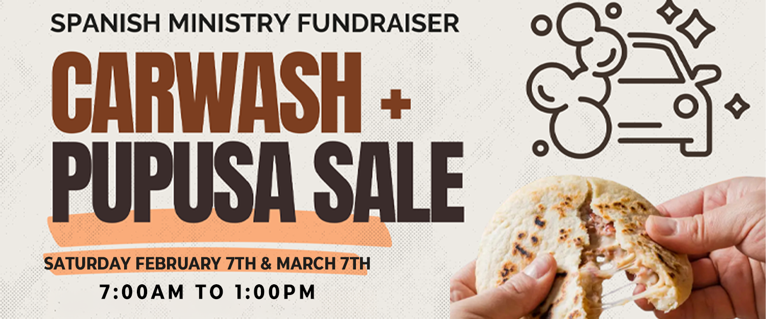 Support our Spanish Ministry! Join us for a Car Wash & Pupusa Sale fundraiser on Saturday, February 7th & Saturday, March 7th. Come get your car sparkling clean and enjoy delicious homemade pupusas—all while helping a great cause!